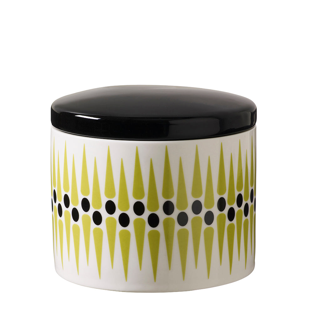 Lækker lav krukke med sort låg og retro-inspireret print i friske farver.